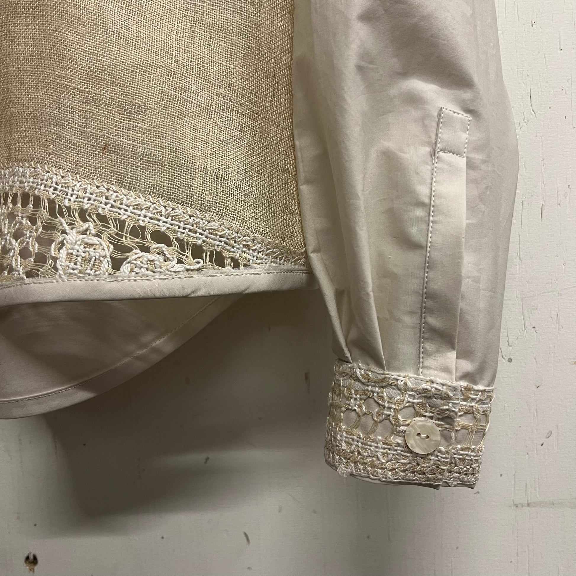 Made using an antique table cloth that’s been faggotted by hand throughout. The rest of the body is made using cotton poplin found in a waste bin.