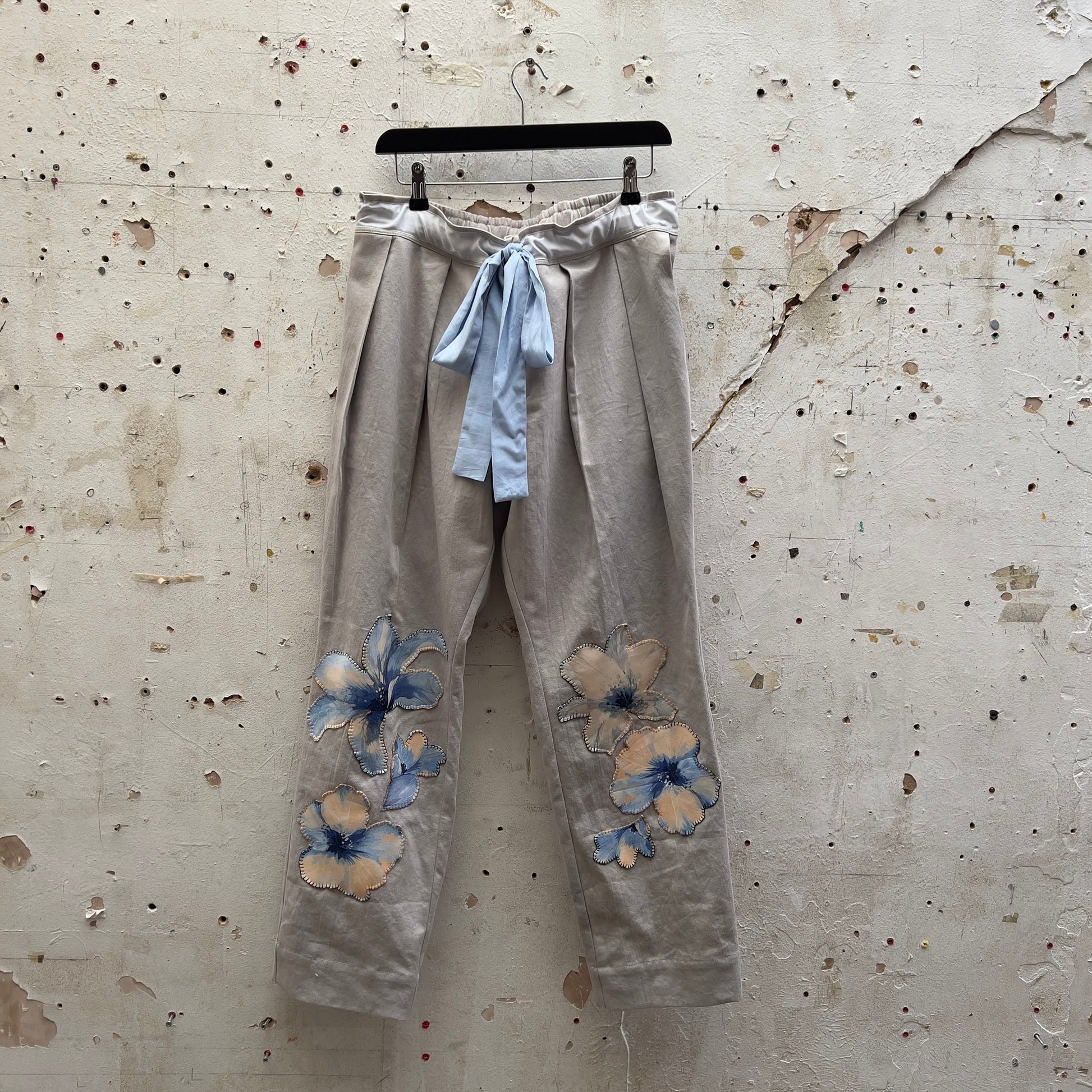 I was given some fabric that was stored in a studio for some time. There was one piece that had many different water colour flowers in a repeat pattern. For these trousers I cut out several of them and then used a blanket stitch to applique them onto the legs.