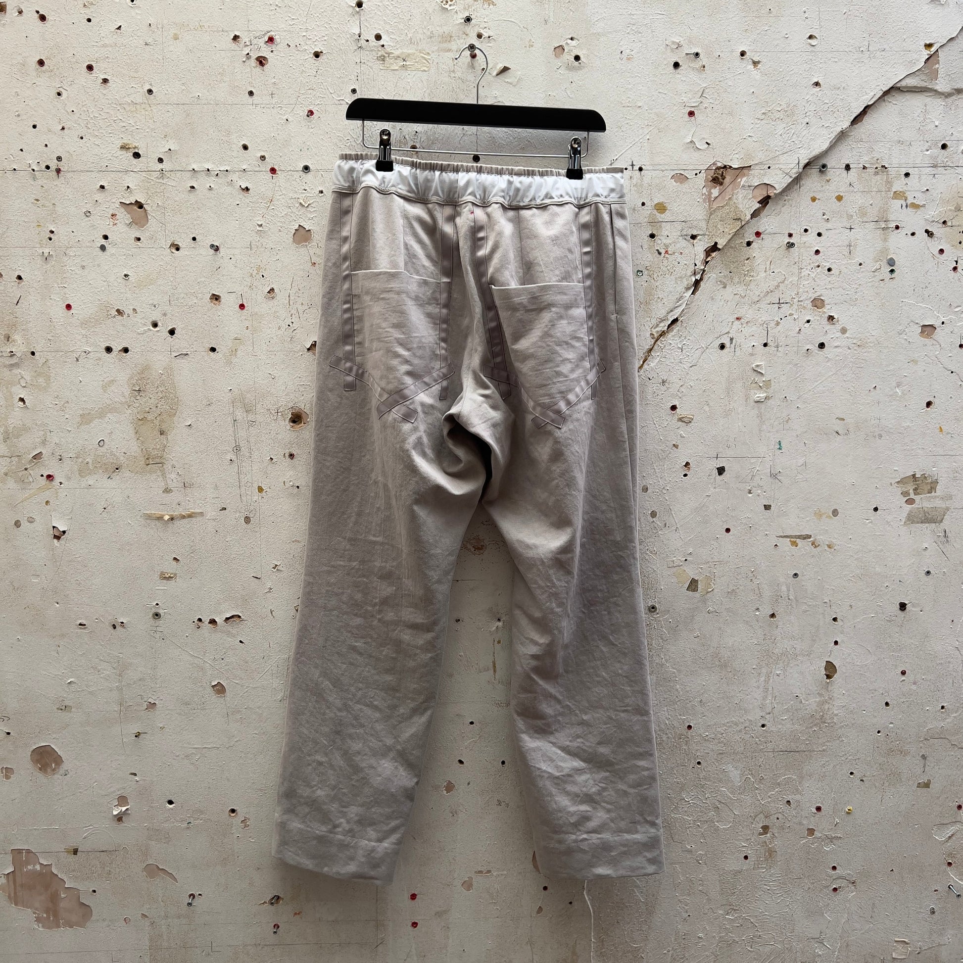 The fabric used is a hand dyed cotton drill and the ink used was waste ink from an industrial fabric printer. The waste is partially elasticated and has a blue dyed bamboo ribbon to tie.