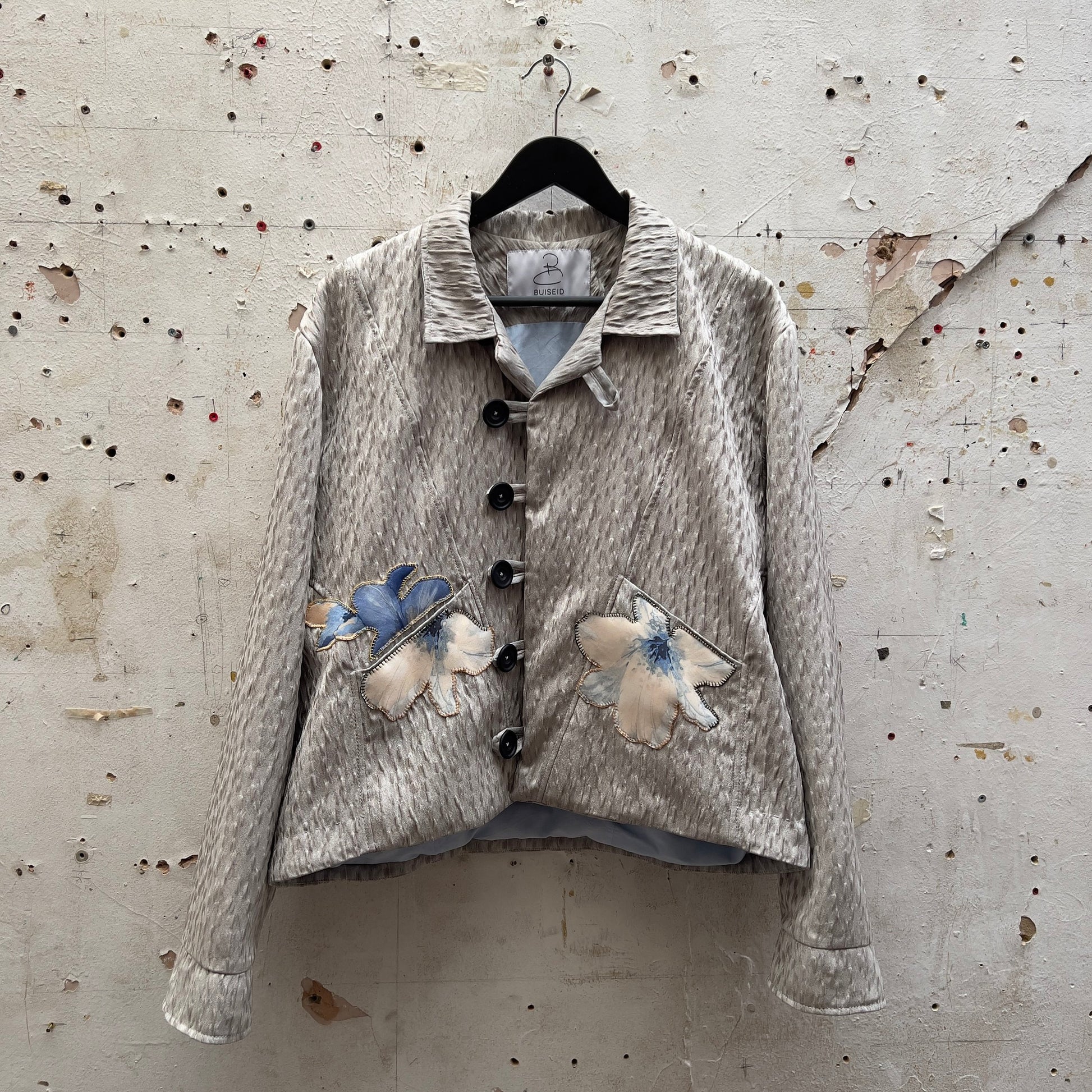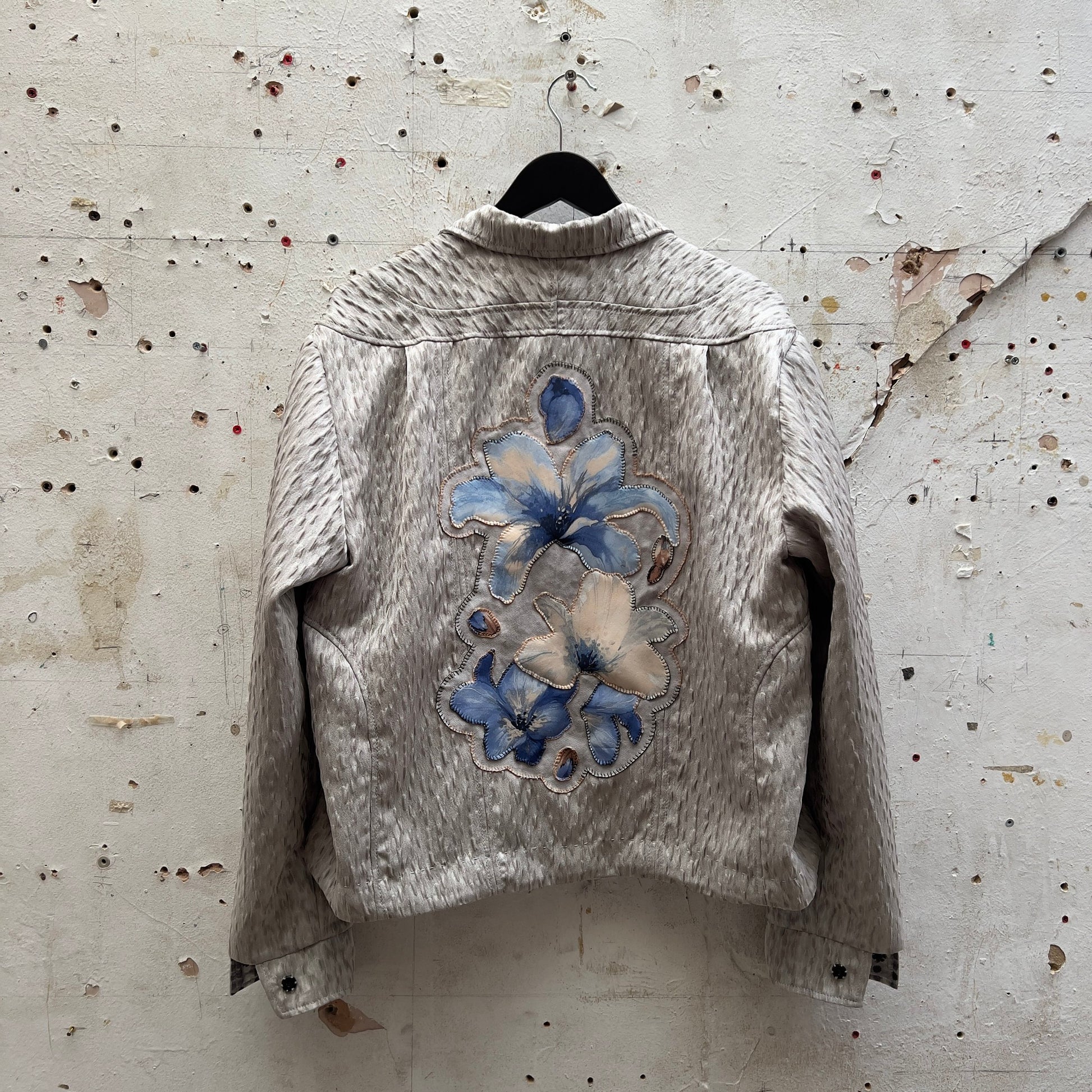 I was given some fabric that was stored in a studio for some time. There was one piece that had many different water colour flowers in a repeat pattern. For this jacket I cut out several flowers and used a blanket stitch to applique them onto the body. This is a time consuming task but the result is something quite special.